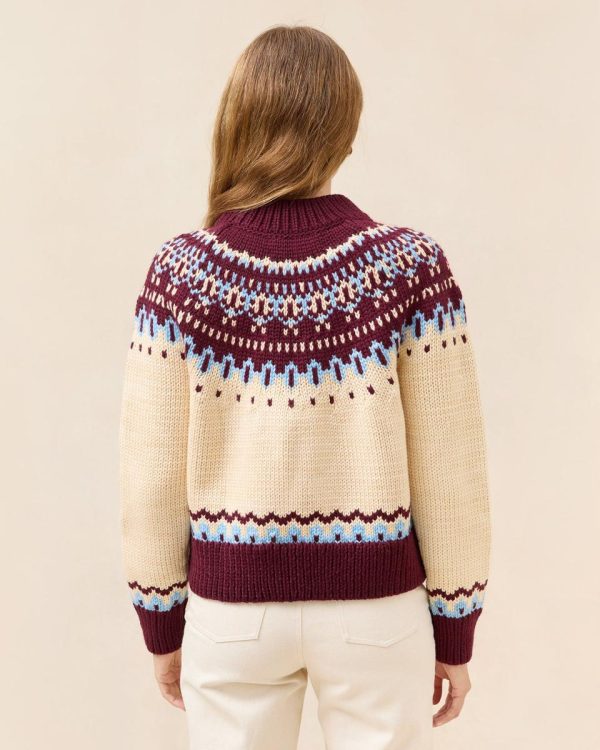 Elegant pullover sweater featuring a beautiful cream wool base with sophisticated maroon and blue intarsia patterning. Designed with a contemporary cropped length and stylish slightly boxy silhouette for modern versatility.