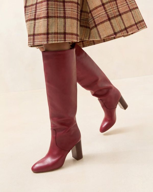 Sophisticated tall shaft boot featuring a sleek high heel crafted in rich wine-hued vachetta leather. Designed with comfort in mind, these boots include a cushioned footbed with elegant gold stamped logo detailing and a refined almond toe. Easy pull-on style with a confident 3.5-inch heel for elevated style.