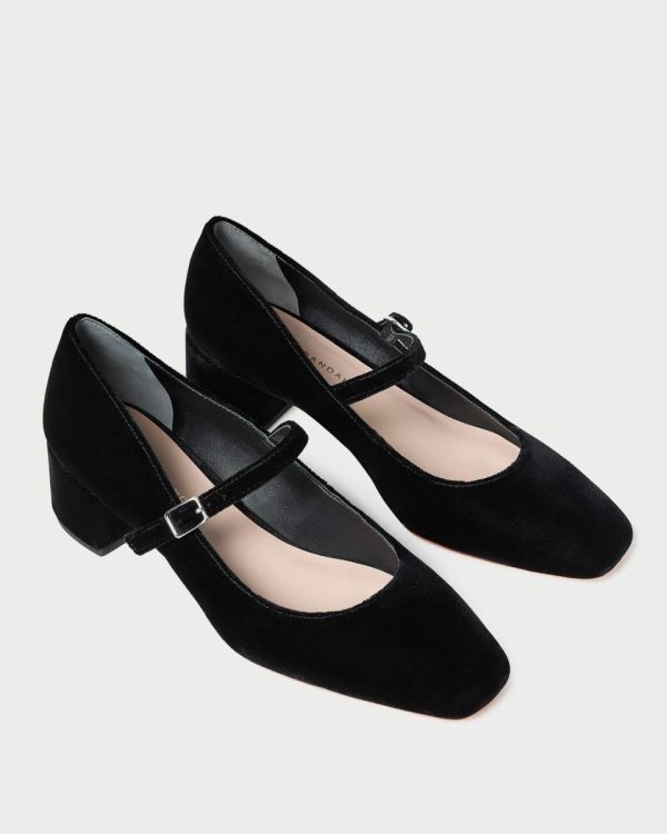Sophisticated Mary Jane mid-heel pump crafted in luxurious black velvet. Features a premium padded leather footbed with gold stamped logo, a contemporary square toe design, and an adjustable strap with secure buckle closure. 1.75-inch heel.