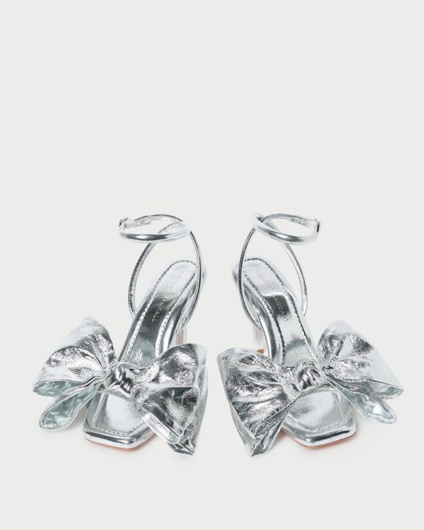 Elevate your style with these stunning silver metallic leather sandals featuring a dramatic oversized statement bow. Designed for both comfort and sophistication, these heels boast a cushioned leather footbed with gold stamped logo detailing and an adjustable ankle strap for the perfect fit. 3.5-inch heel.