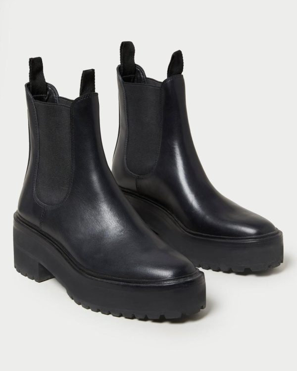 Elevate your style with these fashion-forward Chelsea boots crafted from premium black soft calf leather. Designed for both comfort and sophistication, they feature a convenient stretch gore for easy wear, a cushioned padded footbed for all-day comfort, a timeless rounded toe, and effortless pull-on construction. Perfect for everyday wear with a 2 inch heel and 1 inch platform for just the right amount of lift.