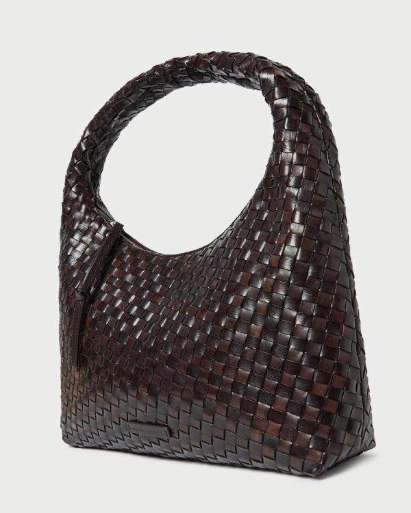 Sophisticated hobo bag crafted in rich chocolate brown woven leather. Features an effortlessly chic relaxed silhouette, secure zipper closure, premium cotton lining, convenient interior zip pocket, and distinctive blind embossed leather logo patch.