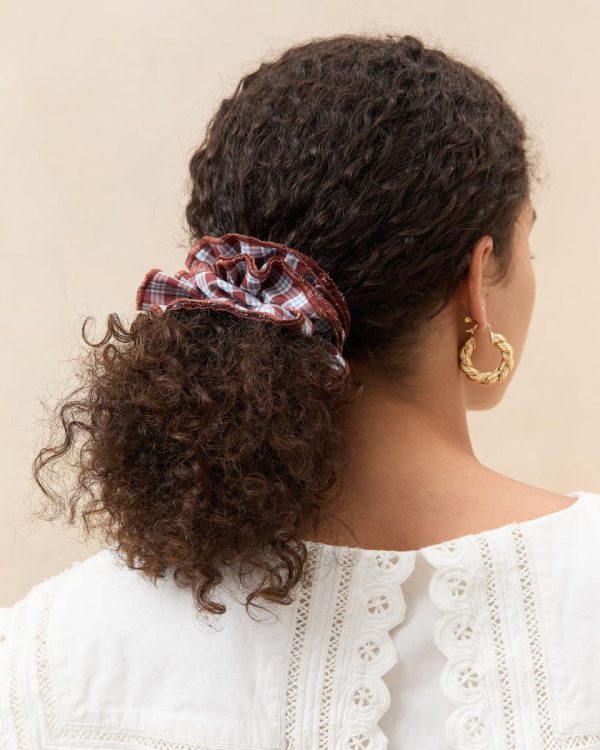 Layered scrunchie in maroon and light blue plaid cotton, finished with maroon lace trim.