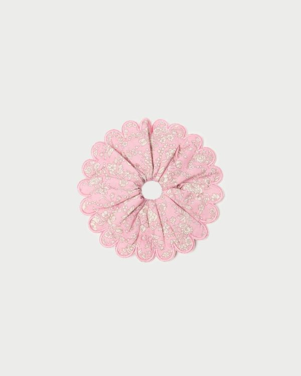 Scrunchie in pink rosette floral print with a delicate scalloped edge.