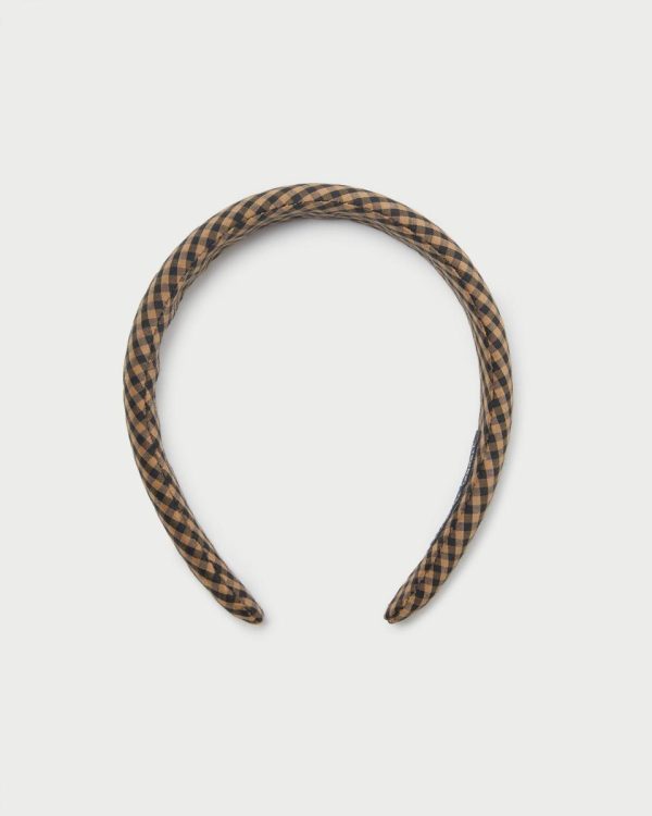 Puffy headband in pleated black and brown checked fabric.