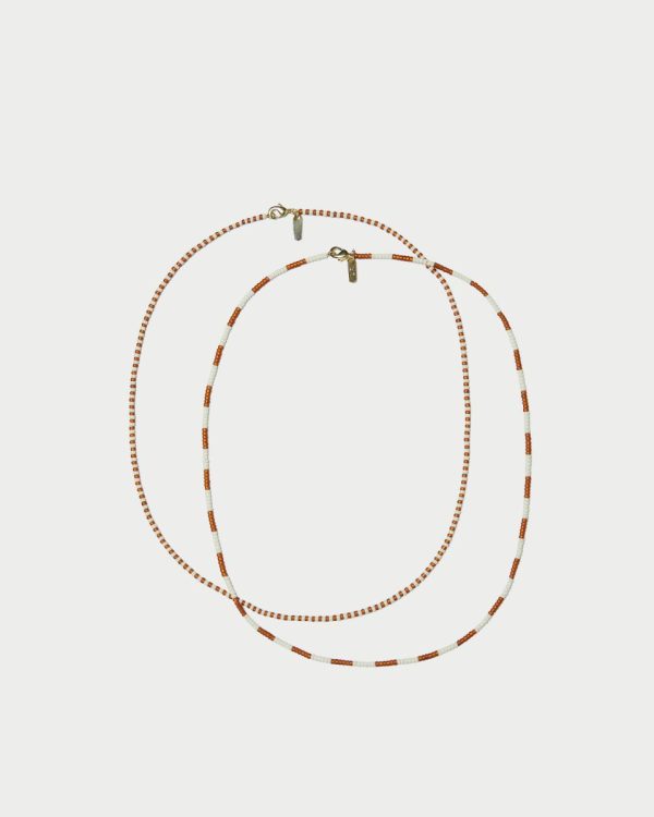 Set of two necklaces—one in amber beads and one in cream multi beads. The beads are strung onto gold-plated brass chains, and the necklaces close with lobster clasp closures.