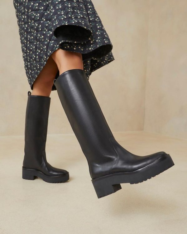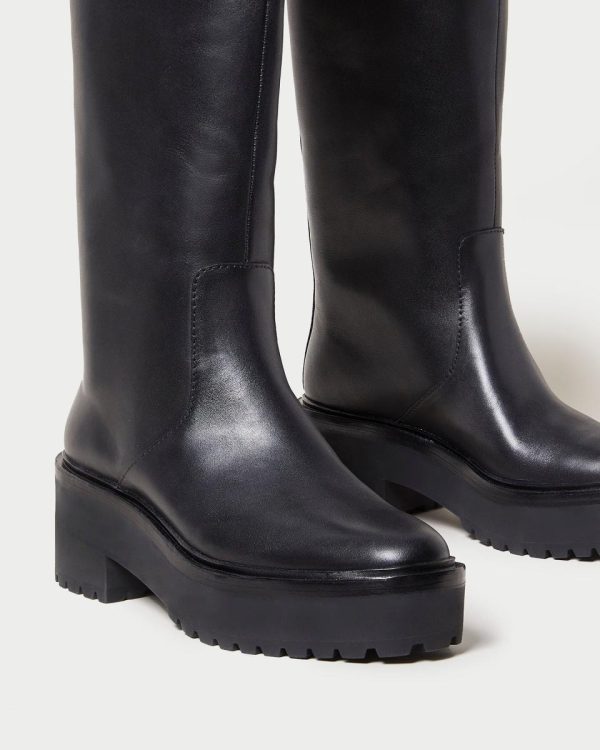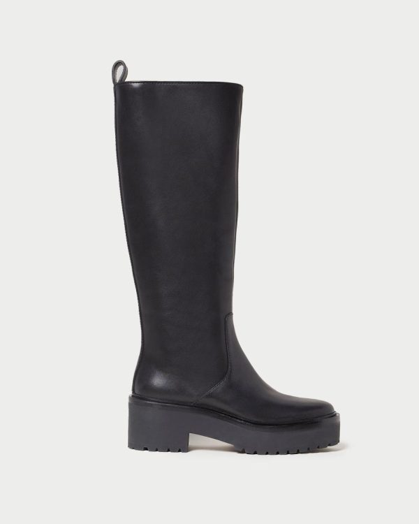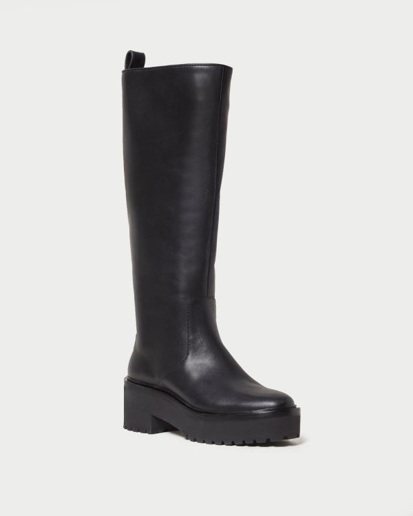 Chunky-soled, tall shaft boot in black soft calf leather. Features a padded footbed, round toe, and pull-on construction. 2 inch heel and 1 inch platform.