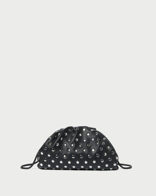 Dome-shaped frame pouch in black leather with silver-stud embellishment. Features a tonal leather strap, frame closure, full lining, and interior card slot.