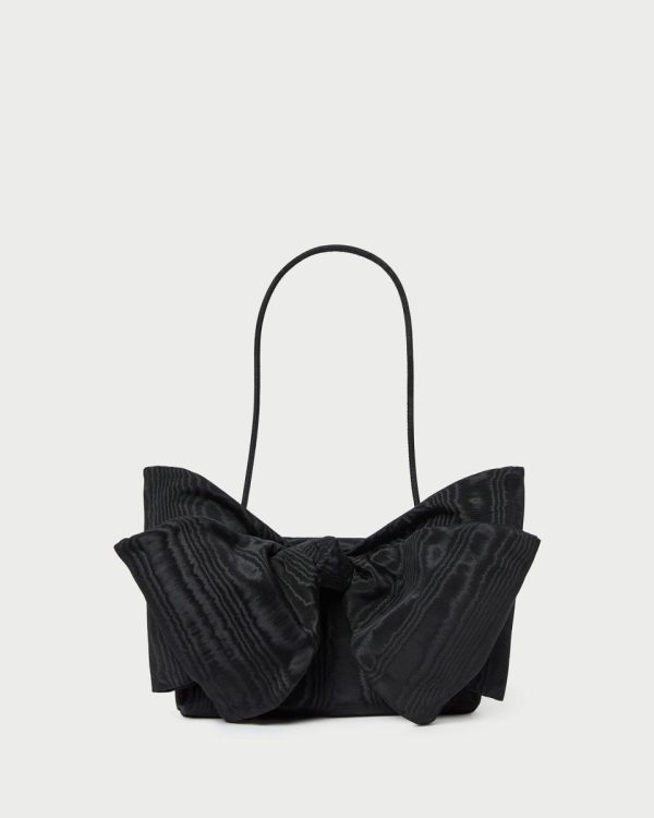 Clutch in black Italian moiré with a statement bow. Features a shoulder strap, full lining, magnetic closure, and exterior metal logo plaque.
