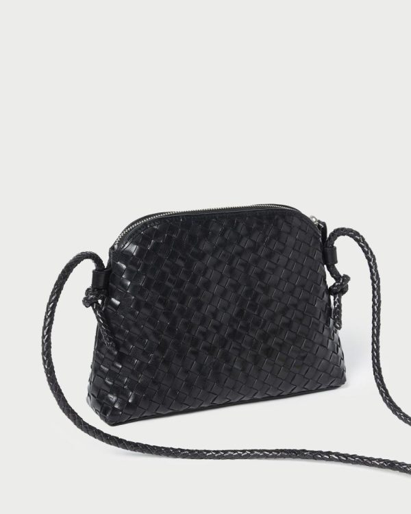 Crossbody bag in black woven leather. Features a zipper closure, cotton lining, interior pocket, and blind embossed leather logo patch.