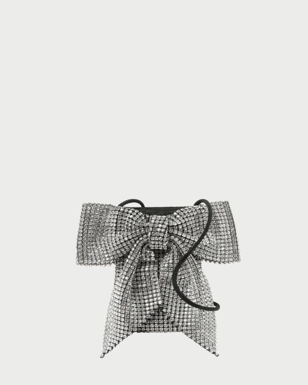 Evening crossbody bag in large-scale silver diamanté with an oversized bow. Features a magnetic closure and lined interior.