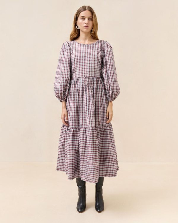 Long-sleeve midi dress in maroon and light blue mini plaid cotton. Features a high neckline, puff sleeves, elastic at the waistband for a cinched look, and a center button at the back.