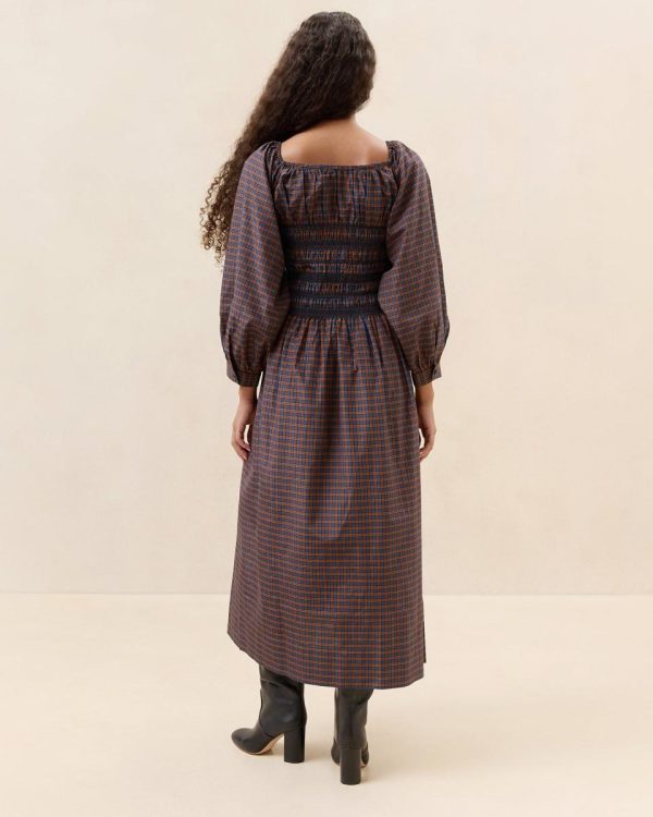 Midi dress in navy and rust plaid cotton. Smocked throughout the torso for a form-fitting look. Features slighted puffed sleeves and buttons along the cuffs.