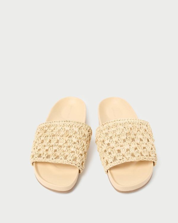 Flat slide sandal in natural crocheted leather. Features a padded leather footbed, a tonal leather sole, and an open toe. Slips on.