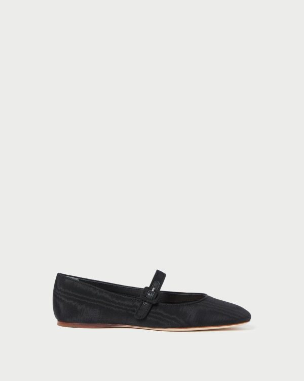 Mary Jane flat in black moiré with delicate tonal piping. Features a padded leather footbed with gold stamped logo, an almond toe, and an adjustable bridge strap with a buckle closure.