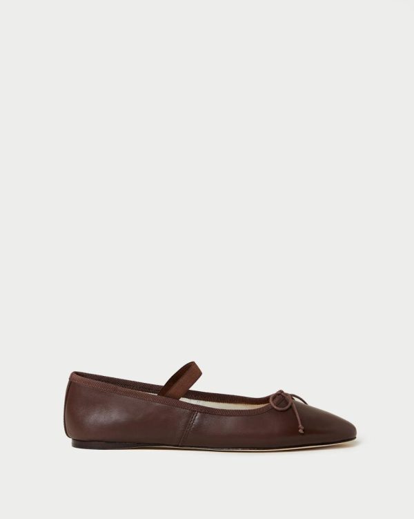 Soft ballet flat in chocolate brown Italian glove calf leather with an elastic bridge strap and bow detail. Features a padded footbed with gold stamped logo and an almond toe.