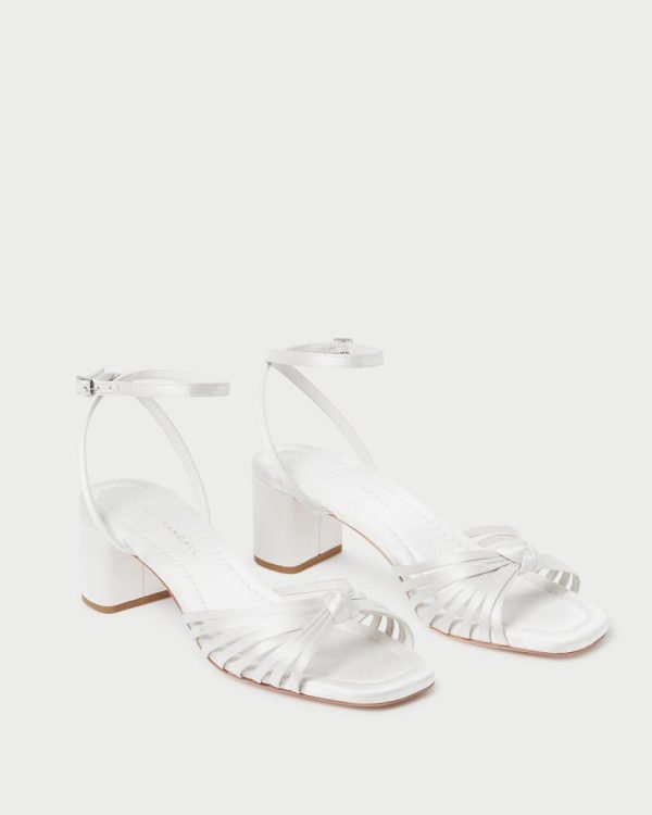 Knotted mid-heel sandal in cream Italian satin with a pieced mignon upper. Features a padded leather footbed, a tonal sole, an open toe, and an adjustable ankle strap. 2-inch heel.