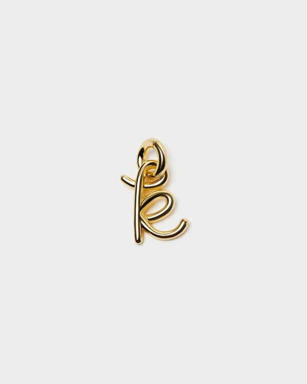 Gold-plated cursive letter “K” charm with functional clasp. Can attach to chains of various sizes.