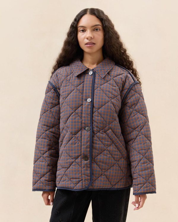 Puffer jacket in navy and rust plaid nylon with black trim. Features drop shoulders, pockets, and buttons at the front and sides for a more fitted look.