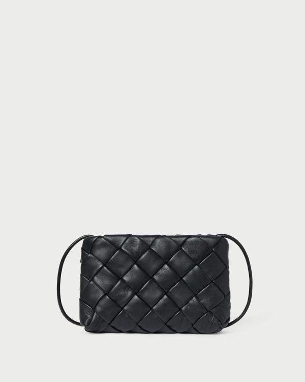 Mini shoulder bag in black woven nappa leather. Features a removable tonal strap, full lining, and magnet closure.