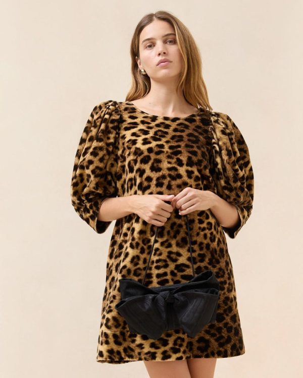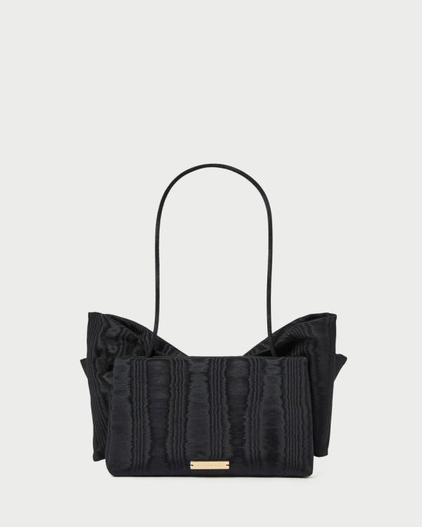 Clutch in black Italian moiré with a statement bow. Features a shoulder strap, full lining, magnetic closure, and exterior metal logo plaque.
